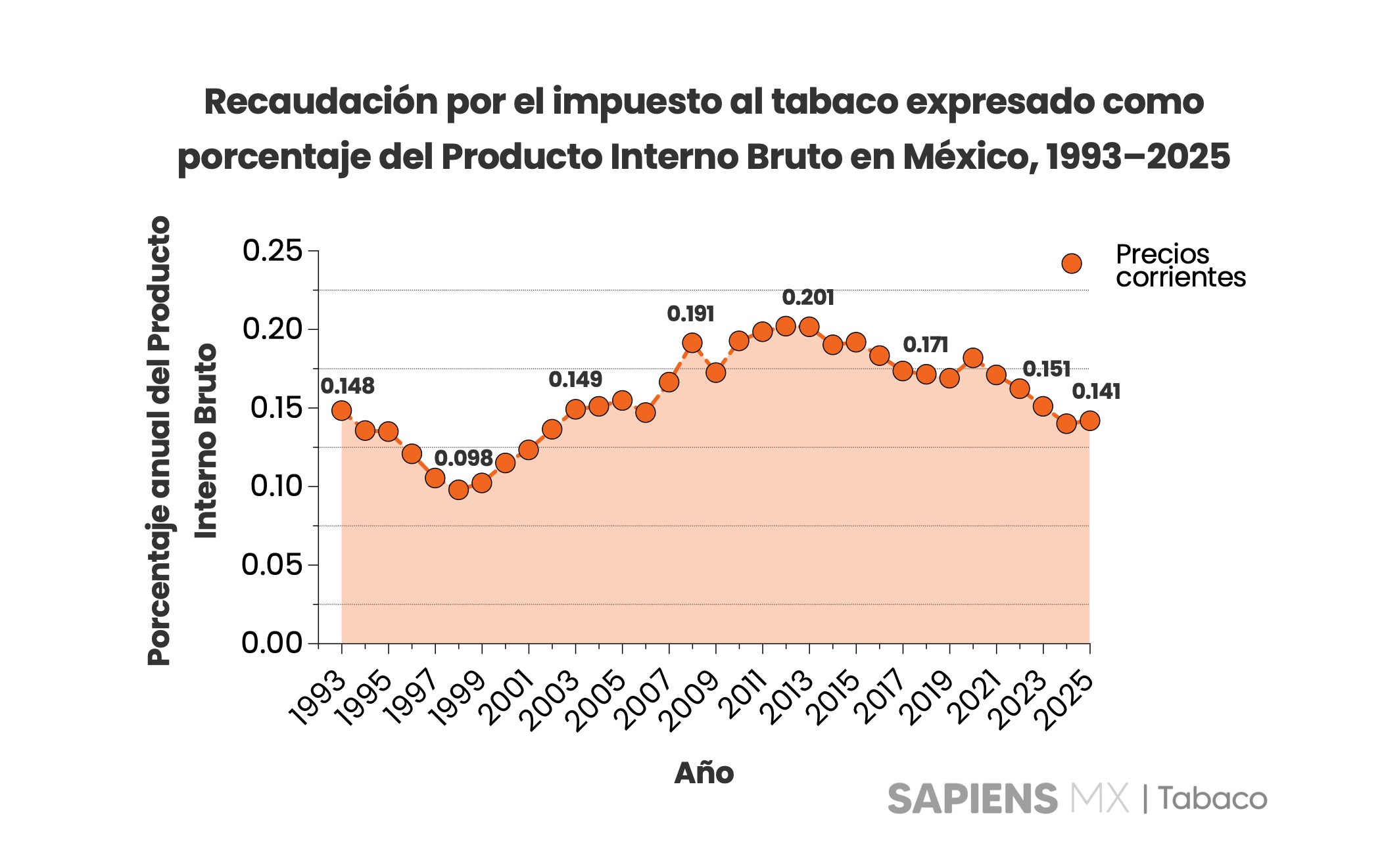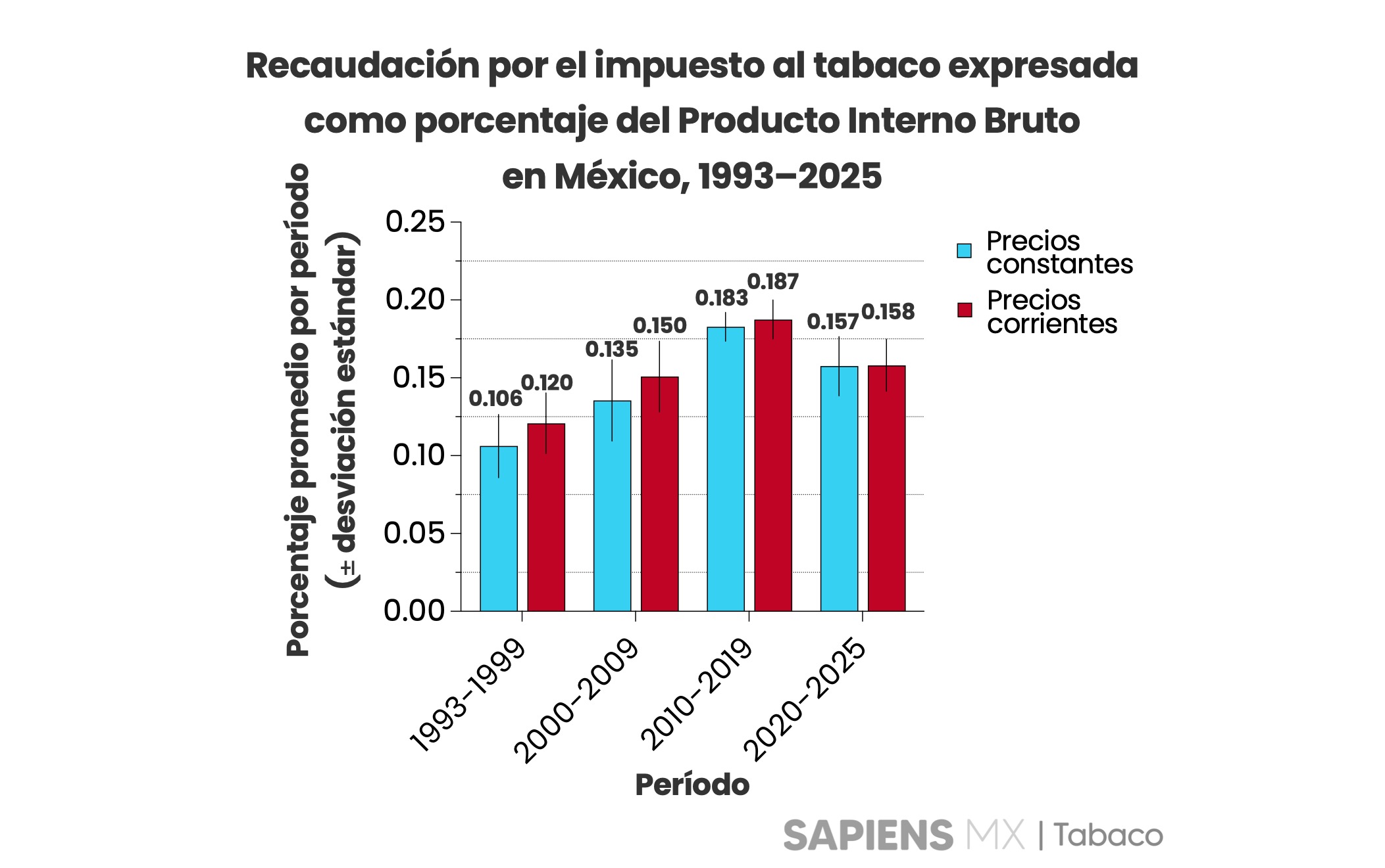 Los indicadores que se presentan en esta sección permiten analizar la evolución de los impuestos al tabaco en México, así como de las principales variables que modifican: precios, asequibilidad, consumo y recaudación. Los aumentos de impuestos elevan los precios, ya que constituyen una parte importante de ellos; si los precios crecen más rápido que los ingresos, disminuye la asequibilidad; los precios más altos reducen el consumo; y los impuestos más elevados también incrementan la recaudación.