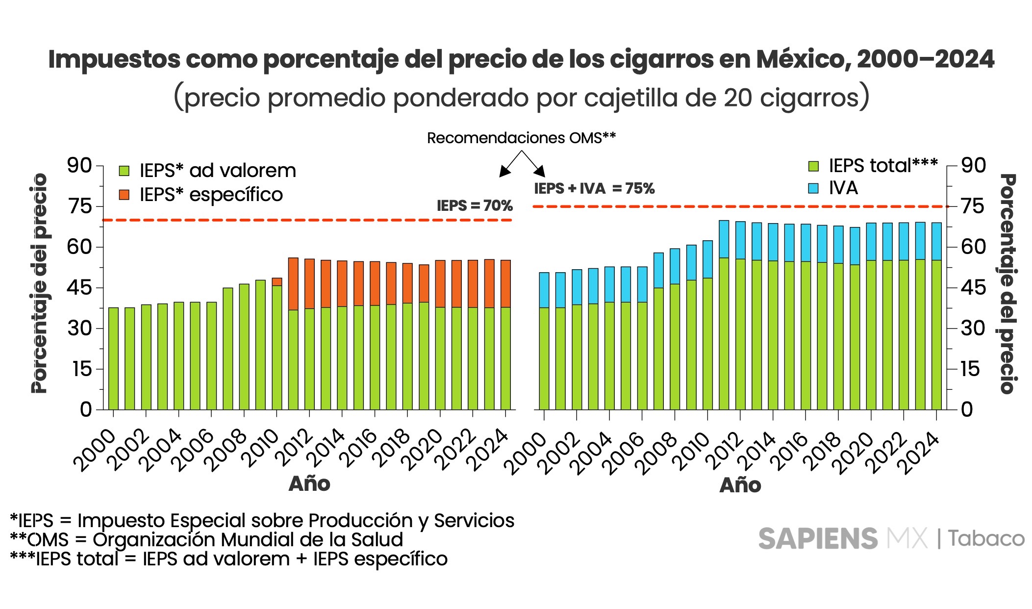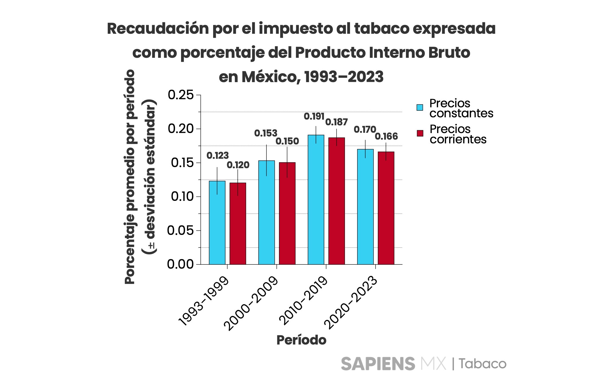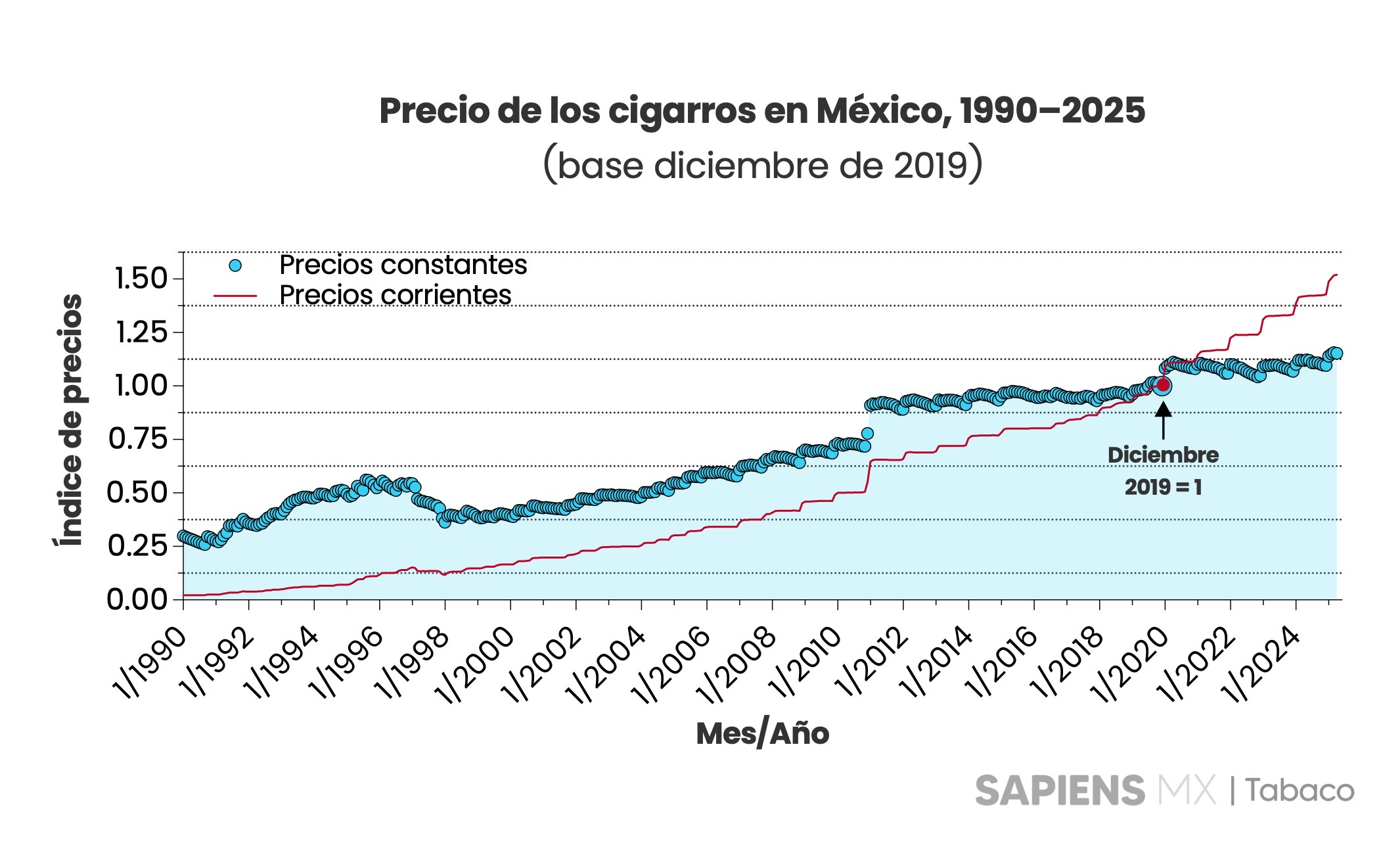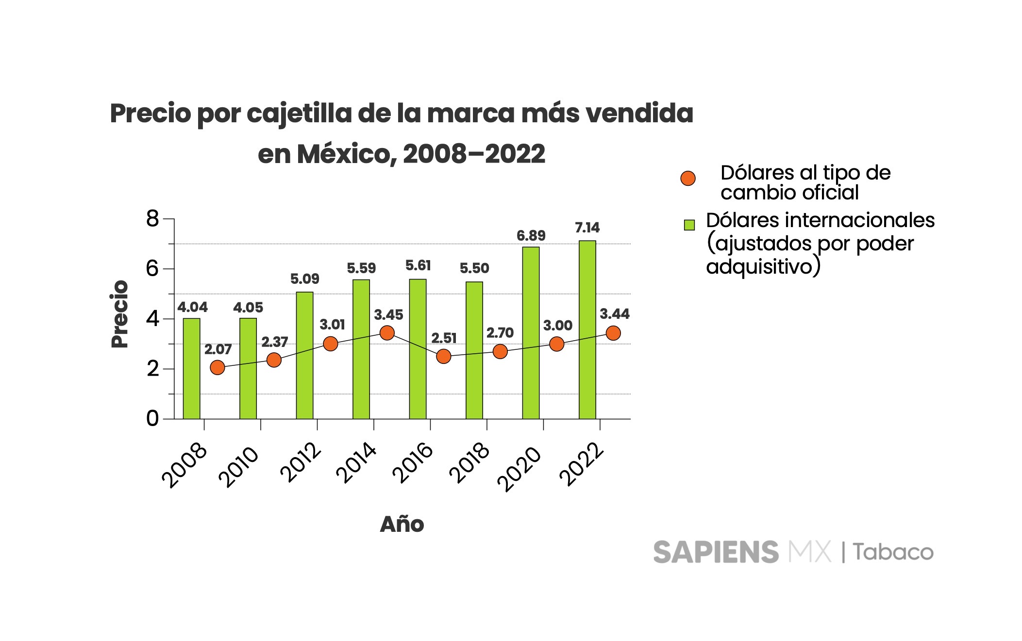 Los indicadores que se presentan en esta sección permiten analizar la evolución de los impuestos al tabaco en México, así como de las principales variables que modifican: precios, asequibilidad, consumo y recaudación. Los aumentos de impuestos elevan los precios, ya que constituyen una parte importante de ellos; si los precios crecen más rápido que los ingresos, disminuye la asequibilidad; los precios más altos reducen el consumo; y los impuestos más elevados también incrementan la recaudación.