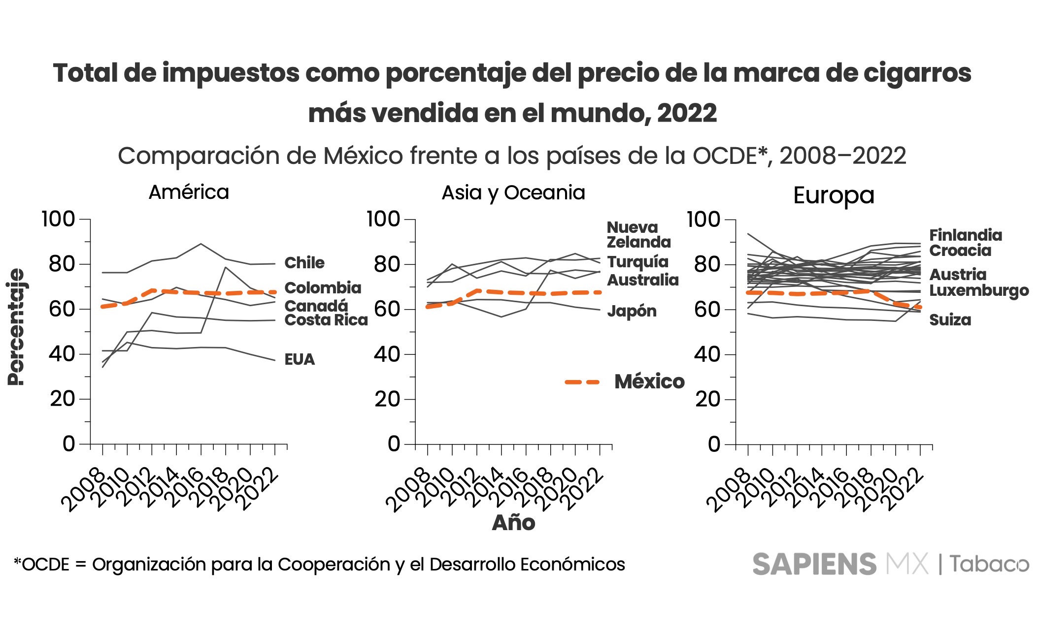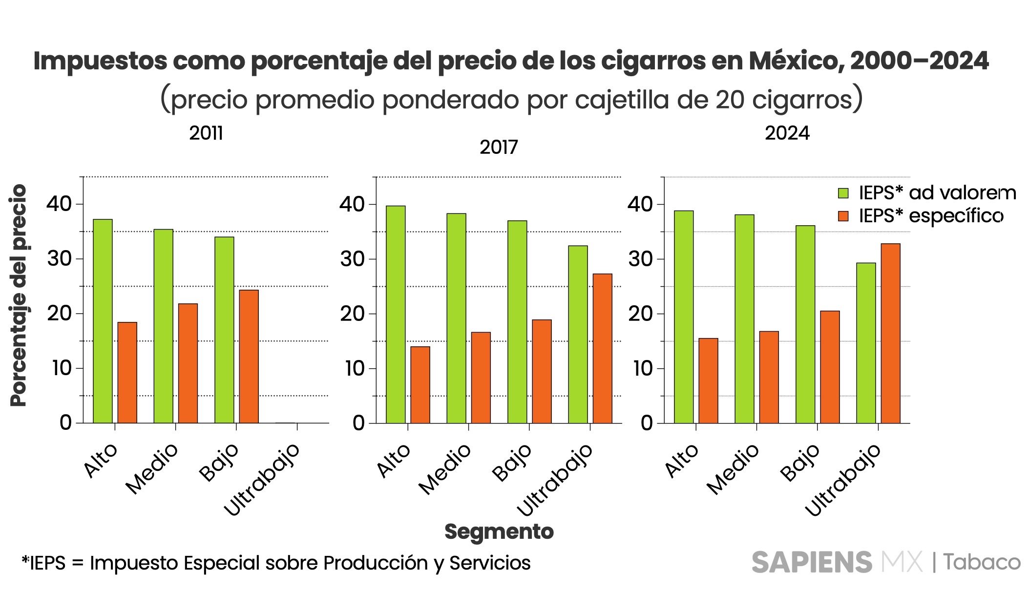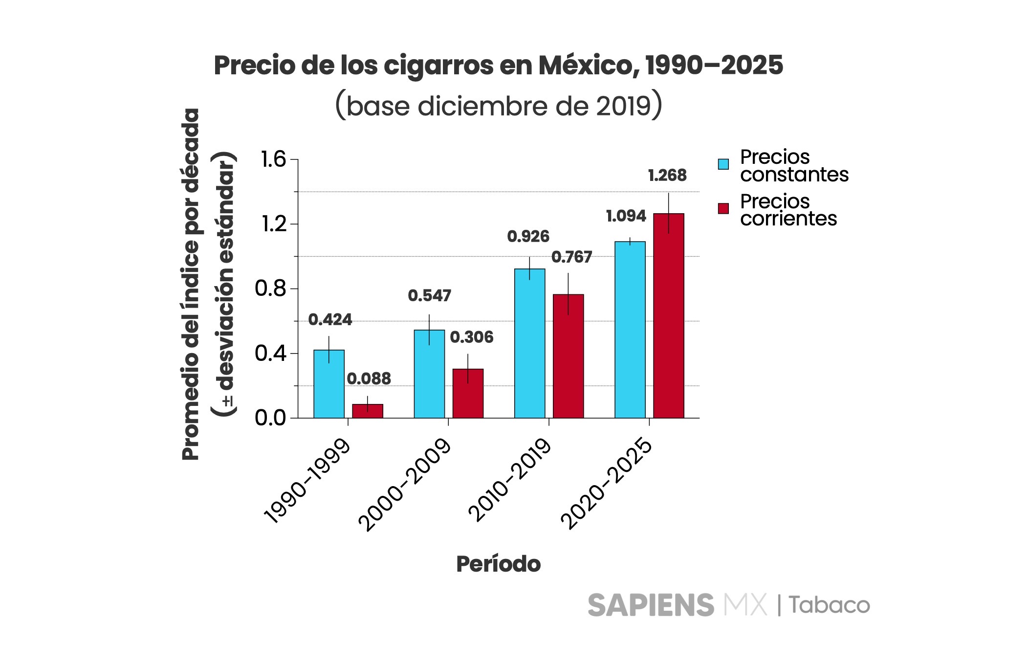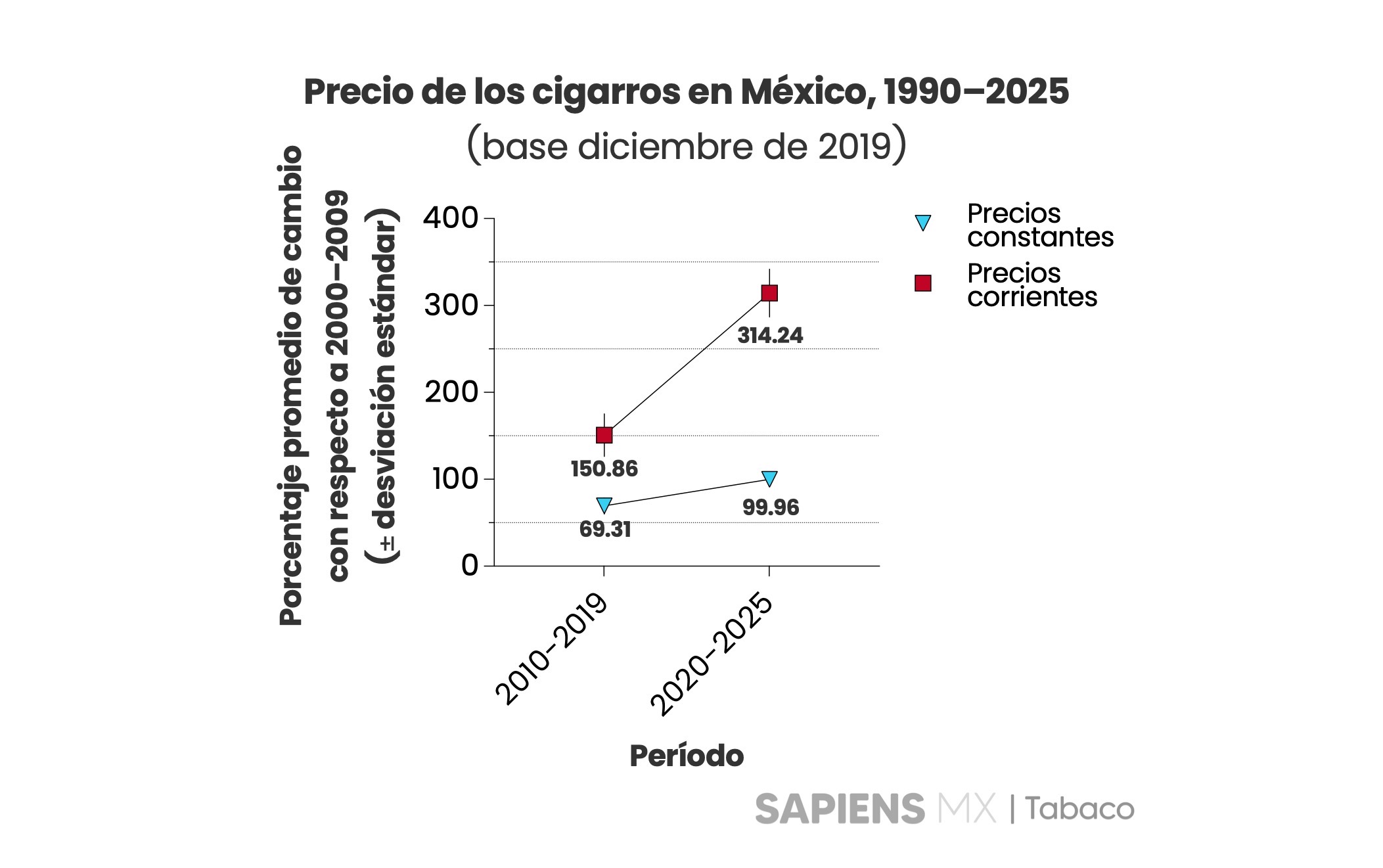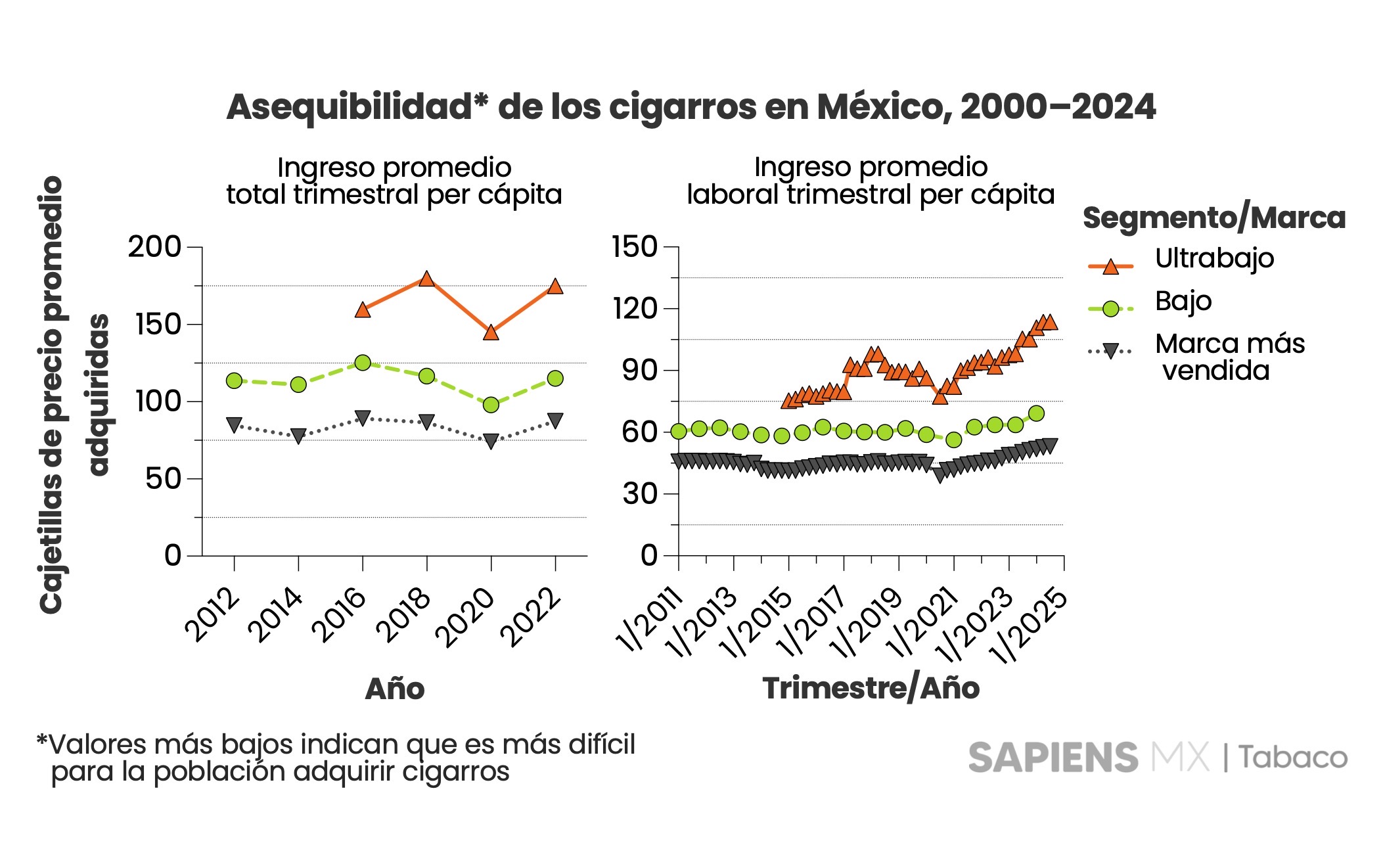 Los indicadores que se presentan en esta sección permiten analizar la evolución de los impuestos al tabaco en México, así como de las principales variables que modifican: precios, asequibilidad, consumo y recaudación. Los aumentos de impuestos elevan los precios, ya que constituyen una parte importante de ellos; si los precios crecen más rápido que los ingresos, disminuye la asequibilidad; los precios más altos reducen el consumo; y los impuestos más elevados también incrementan la recaudación.