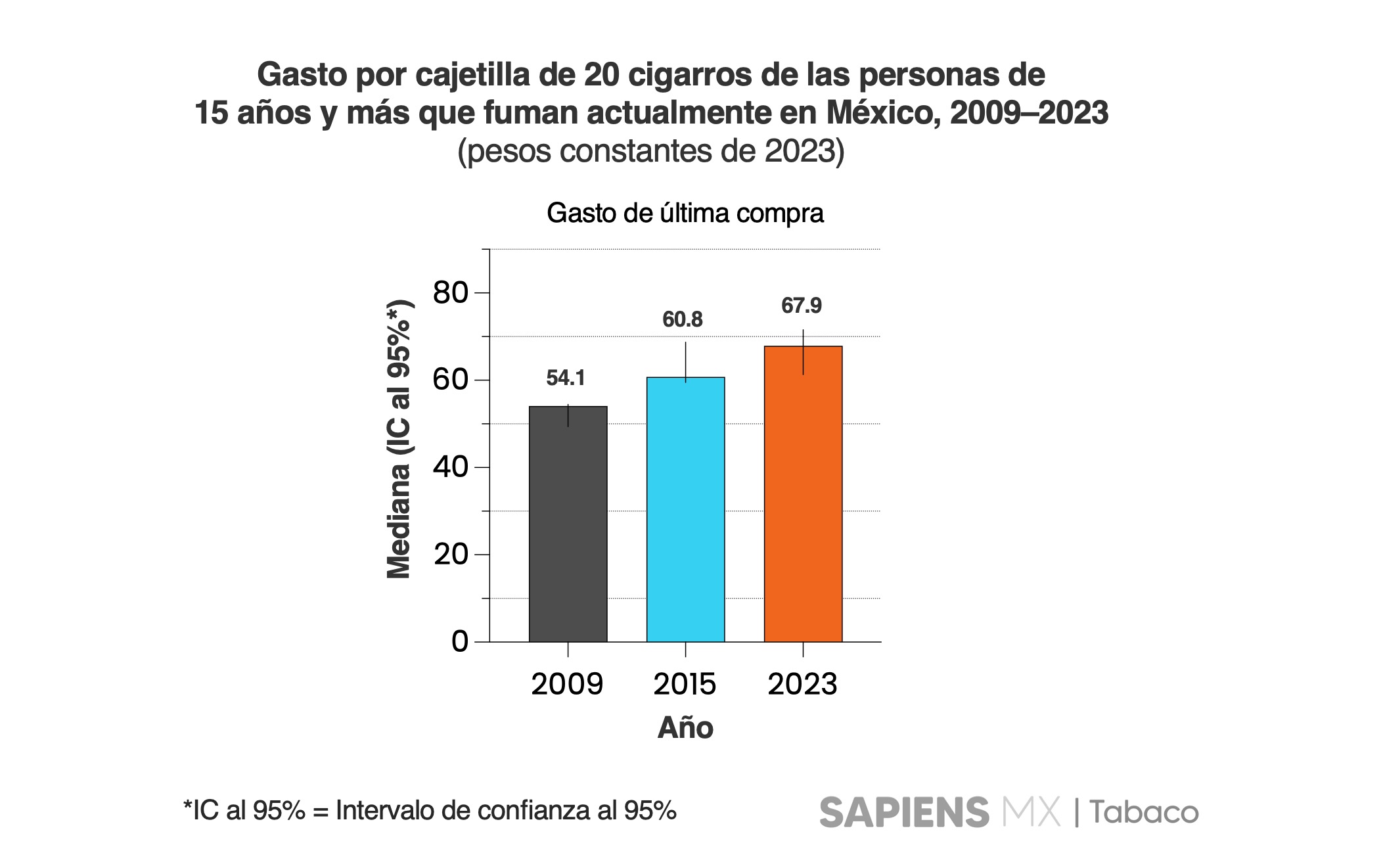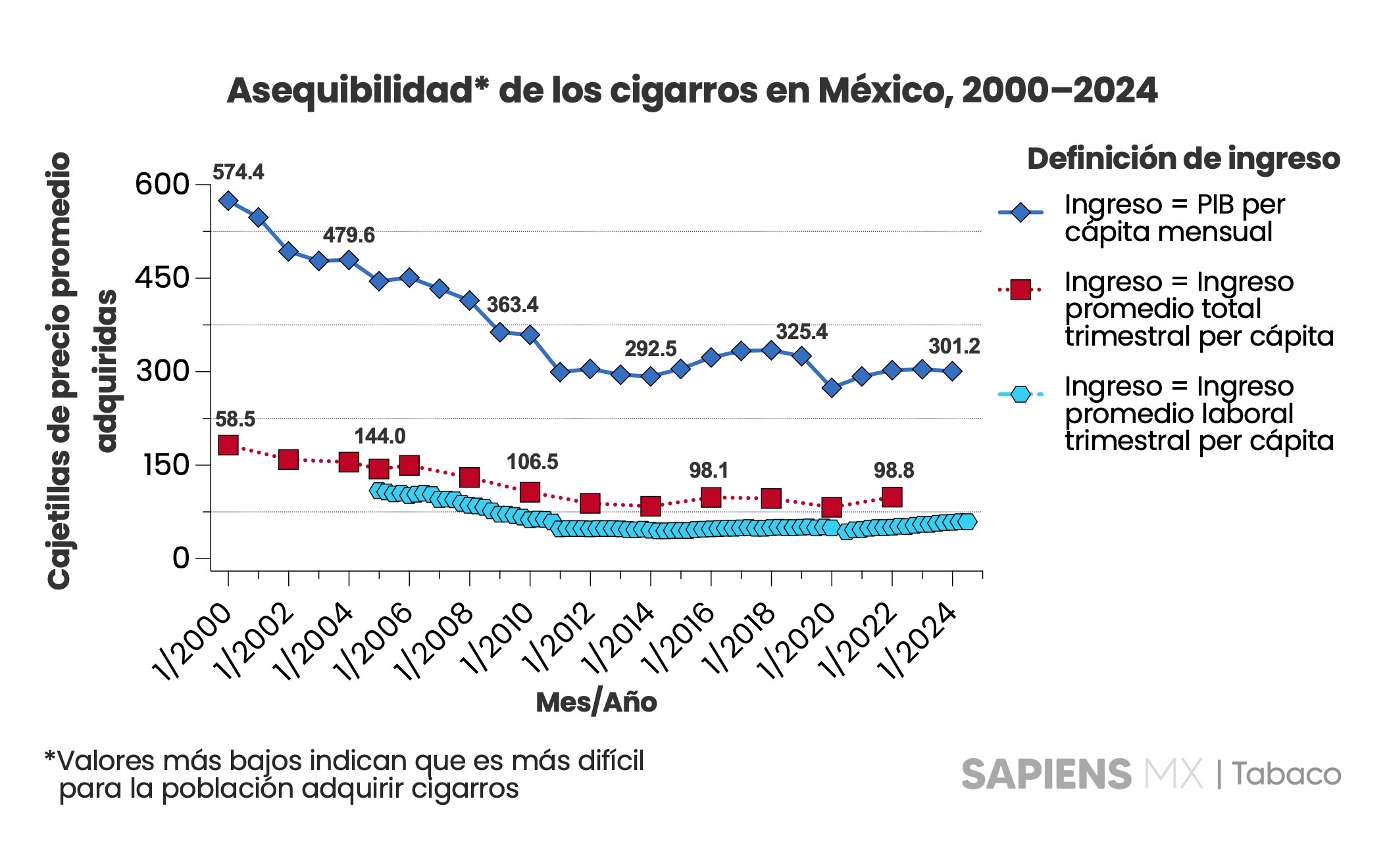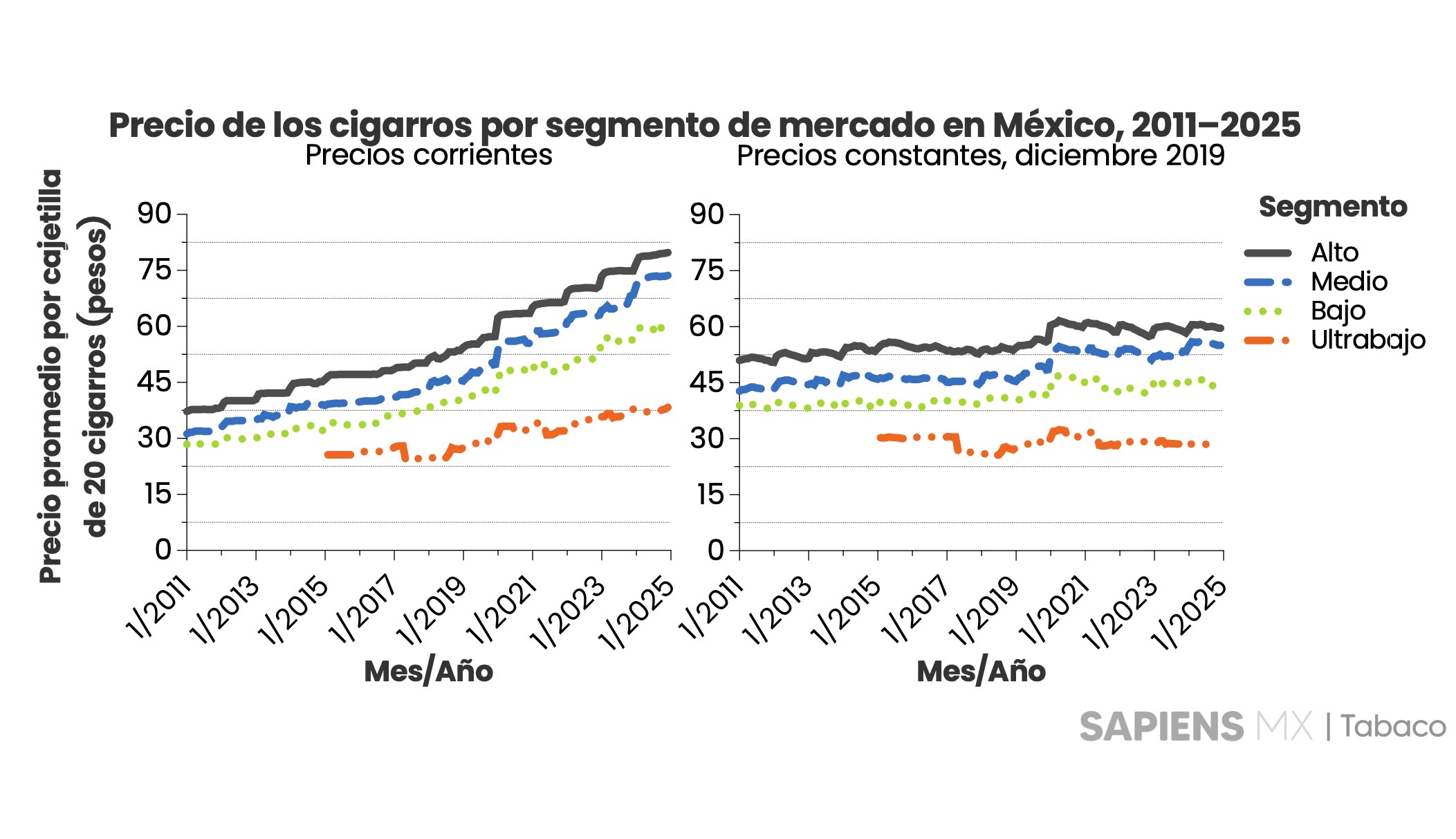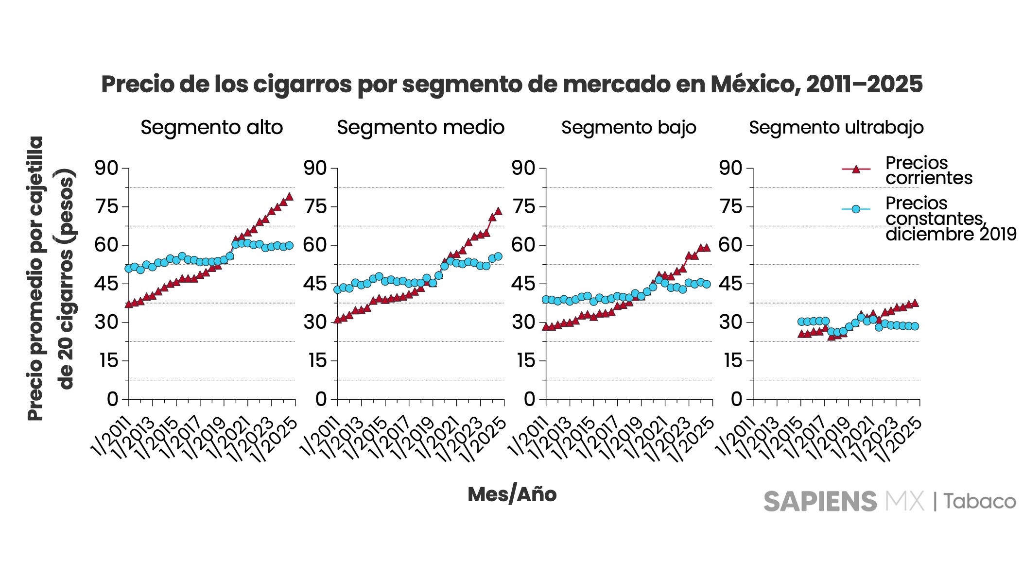 Los indicadores que se presentan en esta sección permiten analizar la evolución de los impuestos al tabaco en México, así como de las principales variables que modifican: precios, asequibilidad, consumo y recaudación. Los aumentos de impuestos elevan los precios, ya que constituyen una parte importante de ellos; si los precios crecen más rápido que los ingresos, disminuye la asequibilidad; los precios más altos reducen el consumo; y los impuestos más elevados también incrementan la recaudación.